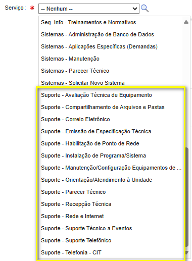 💡Dica: Se o endereço de trabalho do seu cadastro for o endereço do CIT ou do CIT ITR, quando você seleciona um serviço cujo nome inicia com Suporte o seu chamado será direcionado automaticamente para a equipe de suporte de TI residente no CIT, do contrário passará por triagem pelas equipes da sede. Dê preferência por iniciar sua solicitação por um destes serviços, garantindo assim mais rapidez no atendimento.